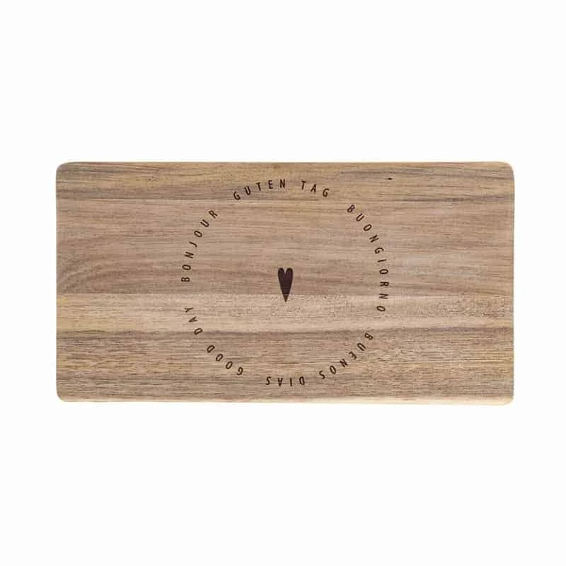 Europa ist mit vielen schönen Sprachen gesegnet – höchste Zeit, ein paar von ihnen auf einem Gute-Laune-Schneidebrettchen zu vereinen! Das aus Akazienholz gefertigte Naturprodukt hat am Boden abgerundete Ränder, die einen angenehmen Griff ermöglichen. Die Schrift wurde stilvoll in das Holz gelasert.