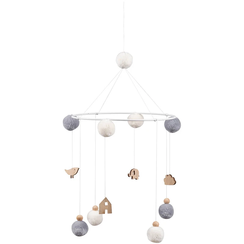 Der letzte Blick vor dem Einschlafen ist meist Richtung Decke gerichtet. Damit der Ausblick für Kinder nicht ganz so langweilig ausfällt, eignen sich Mobiles ideal als Eyecatcher. Das Modell „Pom-Poms“ von räder ist mit einigen besonders schönen Formen wie kleinen Elefanten und Vögelchen besetzt und hochwertig verarbeitet.