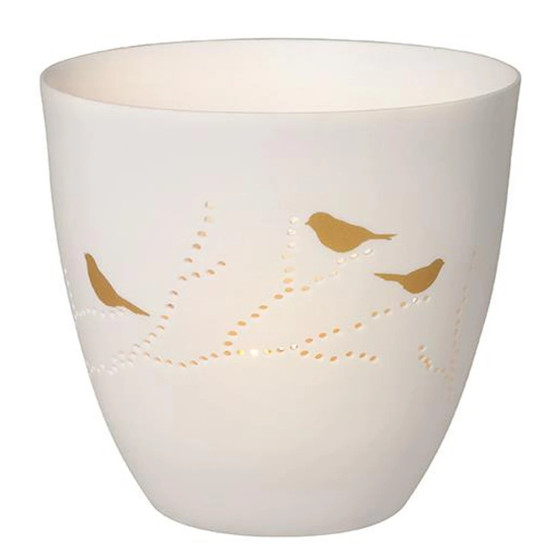 Das Poesielicht “Vögel gold” von räder Design ist aus feinstem, dünnen Porzellan mit Lochmuster gefertigt.