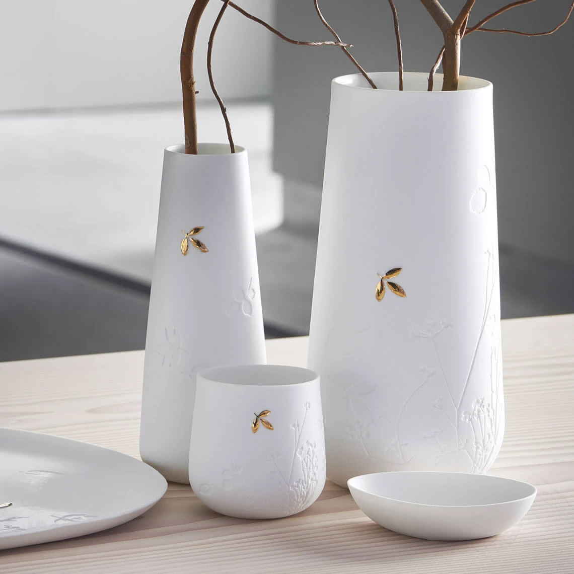 Feine Blatt- und Grasabdrücke auf unglasiertem Porzellan. Ein einzelnes Blatt sticht mit seiner goldenen Glasur hervor.