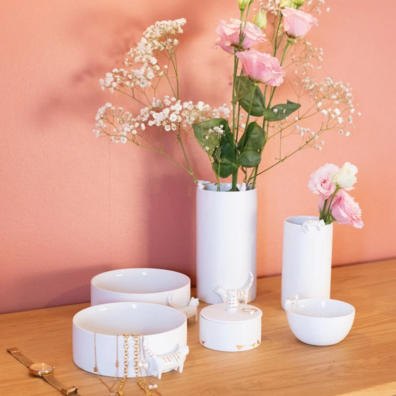 Diese Vase aus der „Porzellangeschichten“-Kollektion des Traditionsherstellers räder versprüht eine besonders elegante Atmosphäre und wertet jedes Blumenbouquete, das darin präsentiert wird, zusätzlich auf. Dank ihres hochwertigen Designs inklusive süßem 3D-Kätzchen, das es sich auf dem Rand gemütlich gemacht hat, ist sie ein feines Detail in jedem Ambiente.