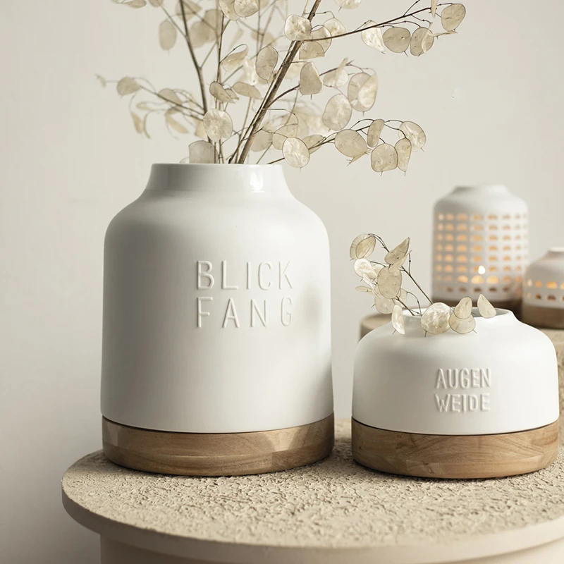 Porzellan & Holz funktionieren im Team einfach immer! Diese Vase aus der „Blickfang“-Kollektion des Traditionsherstellers räder ist der Beweis dafür – und wortwörtlich ein echter „Blickfang“. Dank ihres hochwertigen, schwungvollen Designs inklusive dem eingravierten Text und dem dazugehörigen Untersetzer aus Akazienholz ist sie ein feines Detail in jedem Ambiente.